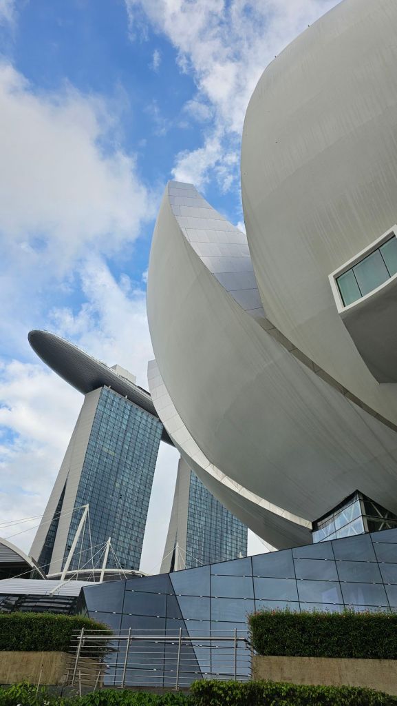 Hneď vedľa leží Gardens by the Bay, futuristický park so „Supertrees“ – vertikálnymi záhradami, ktoré cez deň poskytujú tieň a v noci žiaria pri svetelnej šou.