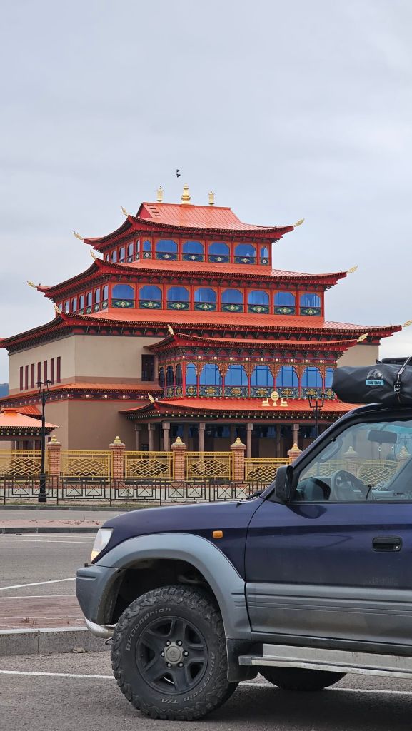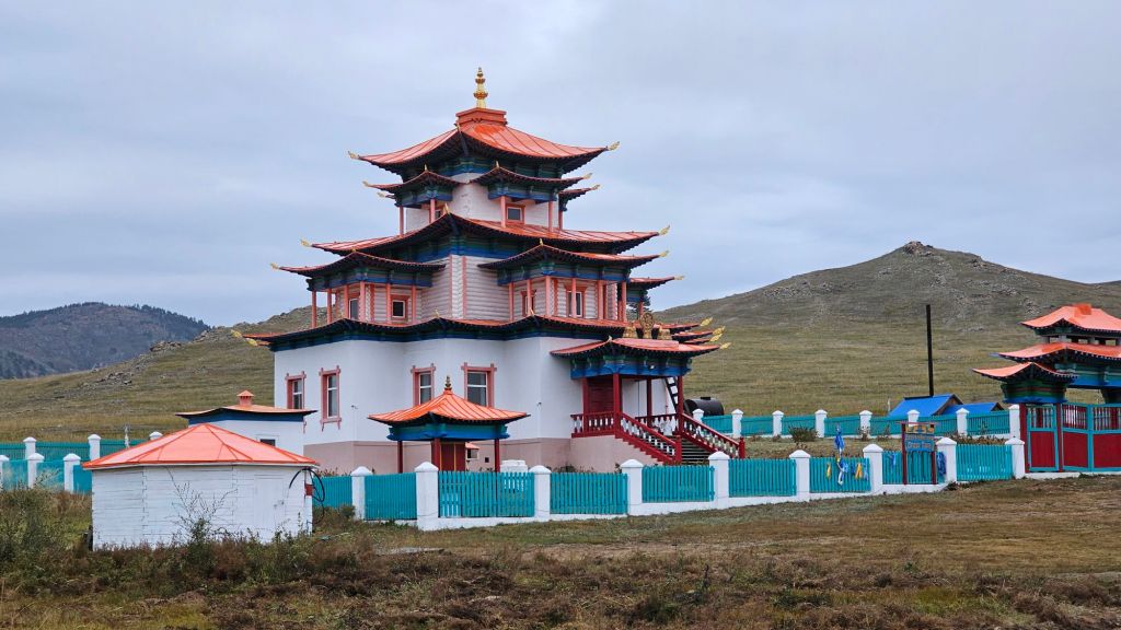 Aha – budhistický chrám. Po toľkých pravoslávnych kostolíkoch zrazu pagoda s farebnými stuhami. Nečakaná zmena. Znamenie, že sa pomaly blížime k mongolským hraniciam. Kultúra sa menila pred očami – tváre ľudí, nápisy, architektúra… všetko nasvedčovalo tomu, že ruská Sibír prechádza do svojho ázijského tieňa.
